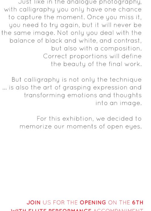 As you can see, calligraphy is a lot like photography and we are not hesitated to exhibit in a photography gallery. I hope you find these similarities while looking at our calligraphy works. Moments of open eyes is about the life of the artists. This is where they are at the moment. Or as the Zen philosophy would say, our life keeps passing and we are never be on the same spot. In that case, this is where we were. We are glad to share our moments with you.