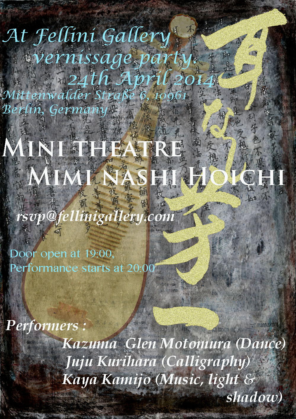Performance, Calligraphy, Music, lights..Ikxs Moss Gallery presents a new production with the Berlin artists:Hui-Chun Lin : Cello.Erika Sofia Sollo : Voice, electronics.Caroline Cecilia…